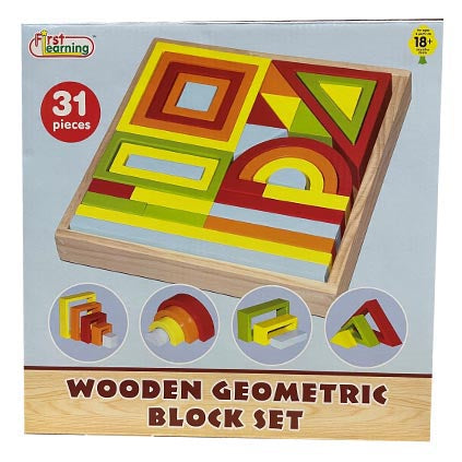 First Learning Wooden Geometric Block Set 31 Coloured Pieces That Fit Together In The Square Frame. Ages 18M+