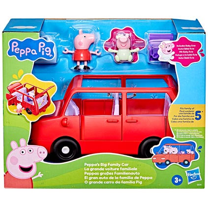 Roll into adventure with Peppa's Big Family Car! This Peppa Pig toy car comes with two 3-inch-scale (7.5 cm) figures, Peppa and her adorable baby sister Evie! Kids can open and close the boot (trunk), bonnet (hood), and doors, and the car's open top makes it easy to put figures in the seats. Ready for a road trip? Pop the suitcase in the boot and install the car seat for Baby Evie! The car can fit up to 5 figures (sold separately, subject to availability) so there's room for the whole Pig family! Toy sets like this make fun gifts for 3 year old girls and boys and up who love Peppa Pig playsets. © 2024 ABD Ltd/Hasbro/HCPL Ltd. HASBRO and PEPPA PIG and all related trademarks TM & © 2024 Hasbro/Hasbro Consumer Products Licensing Ltd. Peppa Pig © 2003 Astley Baker Davies Ltd. and HCPL Ltd.