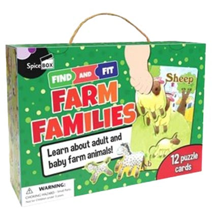 12 sturdy jumbo Find & Fit with pop-out animals to move around and match. Each animal ts neatly into its spot on the card, or can be placed on stands to gallop in your child’s hands. Learn about the animals on the farm and their special baby names. Create a large farm scene by putting all the cards together. Colorful and playfully styled, kids will love learning with these fun and versatile cards.