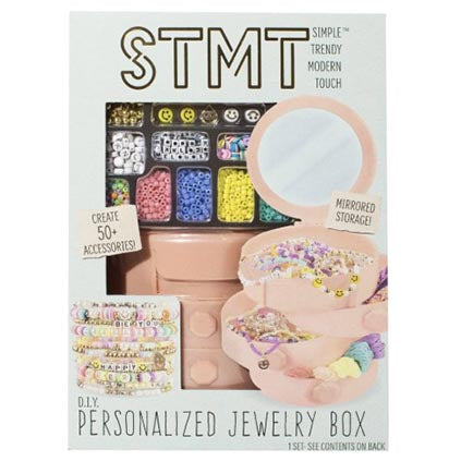 "Create and store beautiful, custom accessories with the STMT D.I.Y. Personalized Pink Jewelry Box! From alphabet beads to metallic beads, pearls, and charms, this jewelry-making kit has everything you need to make over 50 different accessories—plus an exclusive swiveling jewelry box to keep everything organized! String your choice of beads onto any of the 8 vibrant friendship thread colors—mix and match soft polymer discs, smiley faces, and beads in every color of the rainbow to make each piece your own! Use the ABC beads to create Y2K-inspired letter bracelets with your name or inspirational mottos like “Be You” and “Good Vibes,” or make friendship bracelets with cool knotted patterns for you and your crew. When you’re finished, store your beading supplies and finished pieces in the swivel jewelry box. Open the top to reveal a mirror—check out the gorgeous reflection staring back at you! This storage jewelry box measures just under 6-inches tall, making it a great choice for small spaces like vanities, dressers, and craft room counters. The STMT D.I.Y. Personalized Jewelry Box is great for any jewelry-maker ages 8 and up.