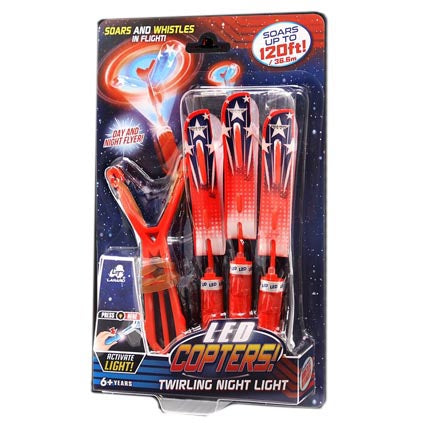 * Ultimate Flying Copters With Led Light And Whistle Sound. * Fly High In Sky, Creates Dazzling Glow By Spinning Action. * 3 Copters And A Hand Launcher Are Included. * Flies Up To 120 Feet. * Led Light On Each Copter Operated By 3 X Ag3/Lr41 Button Cell Batteries (Total 9 X Ag3/Lr41 Button Cell Batteries Are Included, Non-Replaceable) Factory Code: Sc13