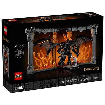 Bearing a plaque with the words ‘You Shall Not Pass’, the model depicts Gandalf the Grey™ in a fearless stance and the Balrog with its mighty wings unfurled against a blazing wall of flames. Both characters are detachable and the Gandalf minifigure has a staff and sword, while the Balrog figure wields a fiery whip and features posable limbs and wings for dynamic display.