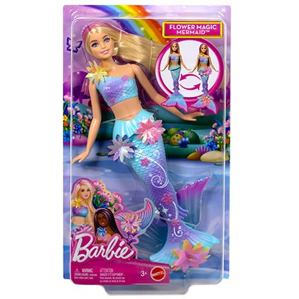 Blossom into fun with Barbie Flower Magic Mermaid doll! Slide the lever on her back to see flowers magically "bloom" from her bodice to her fins, over and over again! Kids can play with these dolls on land and in water for a beautiful blossoming display under the sun or sea. With her iridescent flowers, ombre fins, and pearl headband accessory in her gorgeous long blonde hair with pink highlights – this Barbie mermaid doll is as enchanting as an undersea garden. Doll cannot stand or swim alone. Colors and decorations may vary.