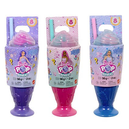 Barbie Pop Reveal Treat Series dolls offer a sensory experience with eight surprises to discover inside a sweets-inspired cup! Unscrew the whipped topping lid to find moldable sand and poke through the film with the straw for squishy fun. Peel the film on the cup to reveal a sweet-scented Barbie doll and six more surprises! Which doll will you reveal? There's Donut Dreams, Cool Cupcake and Sweet Swirl. Continue opening to discover two reusable ice cubes that pop open to reveal themed earrings and a pair of shoes or boots. Mystery bags reveal a colorful skirt, a squishy scented pet and a matching pet bed. Discover more wow with a color-change transformation on Barbie doll's face! Kids will want to collect them all. Each doll sold separately, subject to availability. Dolls cannot stand alone. Colors and decorations may vary.