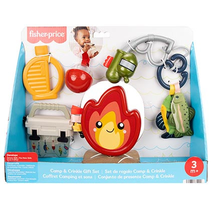 Baby is ready for hours of “outdoor” sensory explorations with this Mini Me Moments Camp & Crinkle Gift Set from Fisher-Price. This adorable set includes 7 fishing and hiking-themed activity toys for newborn developmental play. Little ones can set up camp for tummy time play with a spinning mirror “campfire” and chewy teether canteen. For fun angler adventures, there’s a fishing pole with clicker dial and link, 2 crinkle fish to “catch,” a rattle bobber, and a crinkle tackle box with chewy teether lid. Colors and decorations may vary.