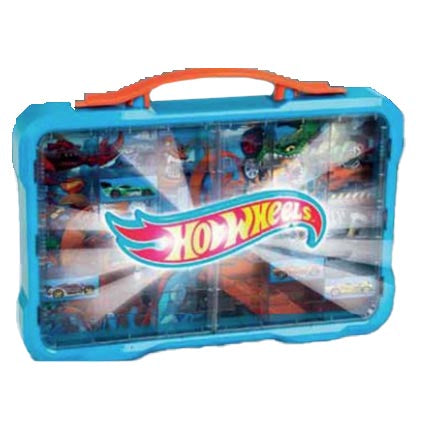 This sturdy display case contains storage compartments for up to 54 cars on a scale of 1:64 (vehicles not included). The display case with a cool poster at the back and a bright Hot Wheels logo on the front can be attached to the wall with standard screws and plugs (not included) or carried around wherever you go thanks to the handy carrying handles.