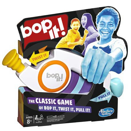 For years, players have loved the simple and exciting ""Bop It, Twist It, Pull It"" actions featured in this iconic Bop It! family game for kids and adults. Players can face off against friends in a multiplayer game with the pass-and-play feature or challenge themselves in solo mode. The game unit has 3 different volume settings and announces the high score at the start of each solo game. It's an entertaining game for parties, and it makes a fun kids' travel game for car rides or vacations. Children's games also make wonderful go-to gifts for kids. Bop It! and Hasbro Gaming and all related properties are trademarks of Hasbro.