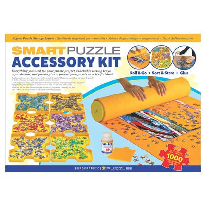 Eurographics Smart 3-Pack Accessory Kit. Box Size: 10" X 14" X 3". Mat Size: 37.5" X 25.5", Tray Size: 7.75" X 7.75", Glue 3.4Oz . Roll & Go Is An Easy Way To Store And Transport Your Puzzle In Progress. Sorting Trays Make Sorting The Puzzle Pieces A Breeze And Glue To Preserve Your Finished Puzzle!