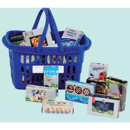 The robust shopping basket with the practical carrying handle is filled to the brim with pretty accessory boxes: Milk, butter, flour, honey, yoghurt, muesli, cheese, tofu, eggs, cake, vegetables, fruit, bread, tomato juice, pizza, vegetable chips, rice cakes, fish, tea, chocolate and rice.