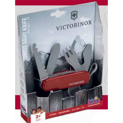 The Swiss Army Knife in Victorinox design is a toy pocket knife with six tools: a saw, a knife, a fork, a spoon, a bottle opener and a magnifying glass.