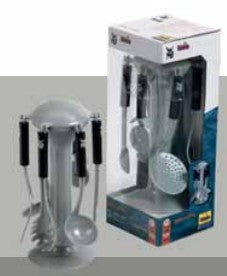 Every well-equipped play kitchen will be delighted with this cutlery rack and crockery in the elegant WMF design. The sturdy cutlery stand contains a pizza cutter, pasta spoon, ladle, baking scoop, slotted spoon and mixing spoon.